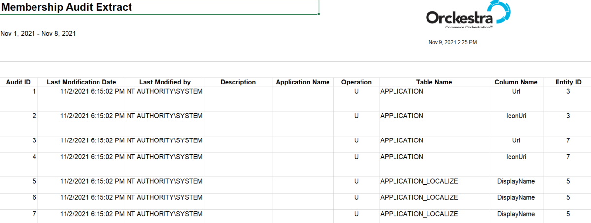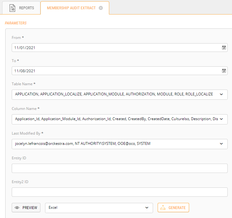 This report provides a list of modifications made on tables in the Membership database. This database manages applications, modules and roles, in addition to user role and permission hierarchies. The report can target a specific table or include all of them. It allows users to pick one or more columns from the selected tables and to specify a time frame to further refine results. The report can also filter results based on the identifiers of up to two modified related entities in the selected tables.