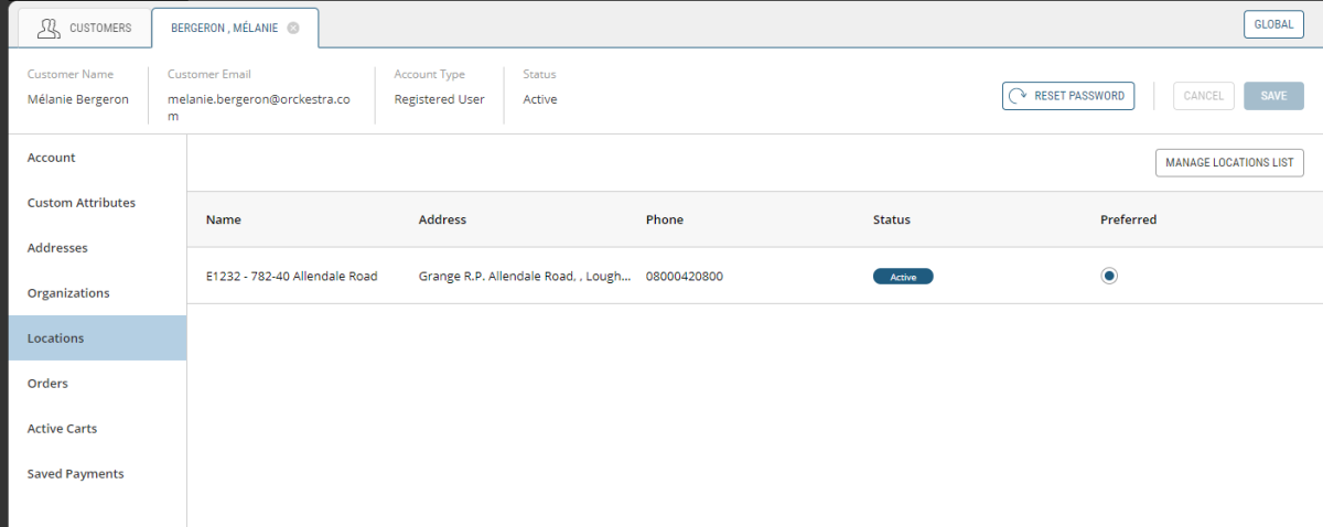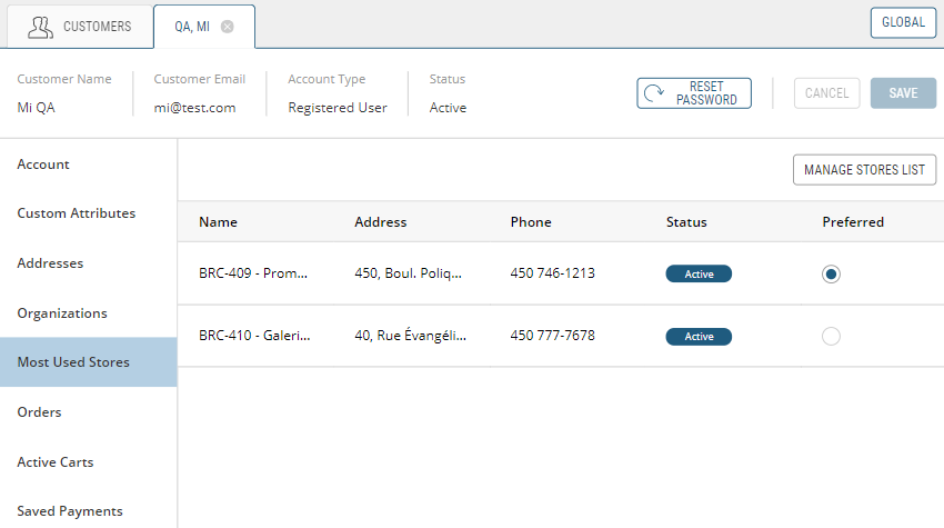 This tab contains the list of a customer's most frequented stores, their addresses, phone numbers and statuses. There is a also selector button to indicate the customer's preferred store.