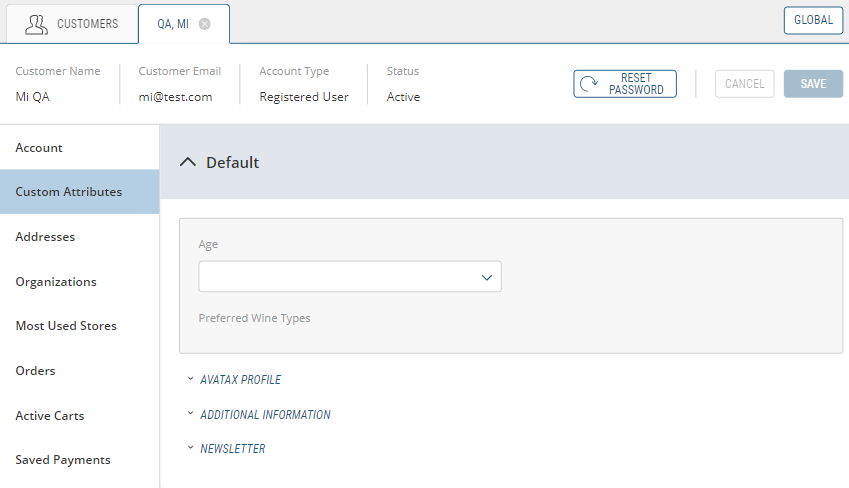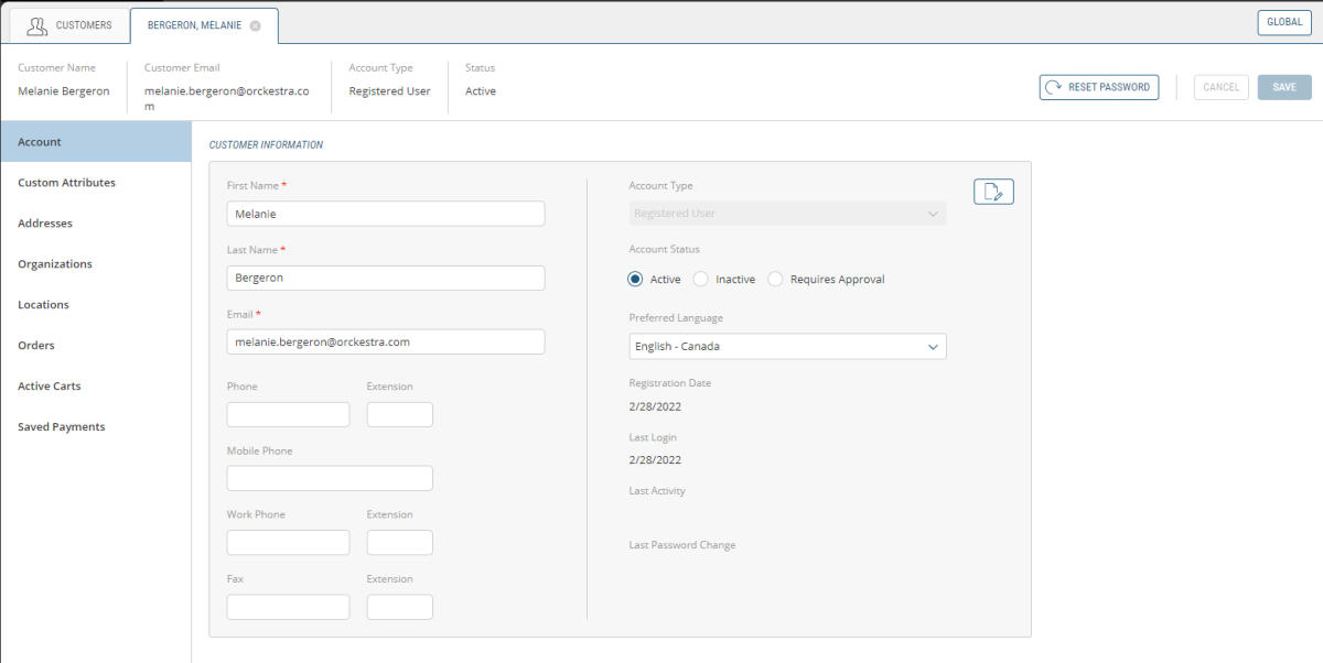 The Account tab displays the customer's first name, last name and email. In addition to this mandatory information, the tab contains fields for personal and work phone numbers, fax number and an extension. Joining these as optional fields is the account type, status and preferred language. Lastly, you are able to see the user's registration date, most recent login on the website, most recent activity and the last time their password was reset.