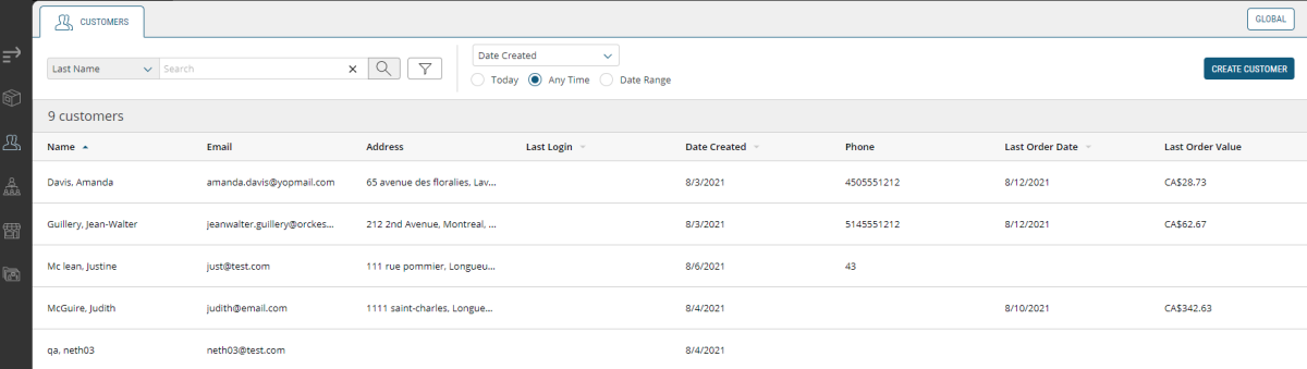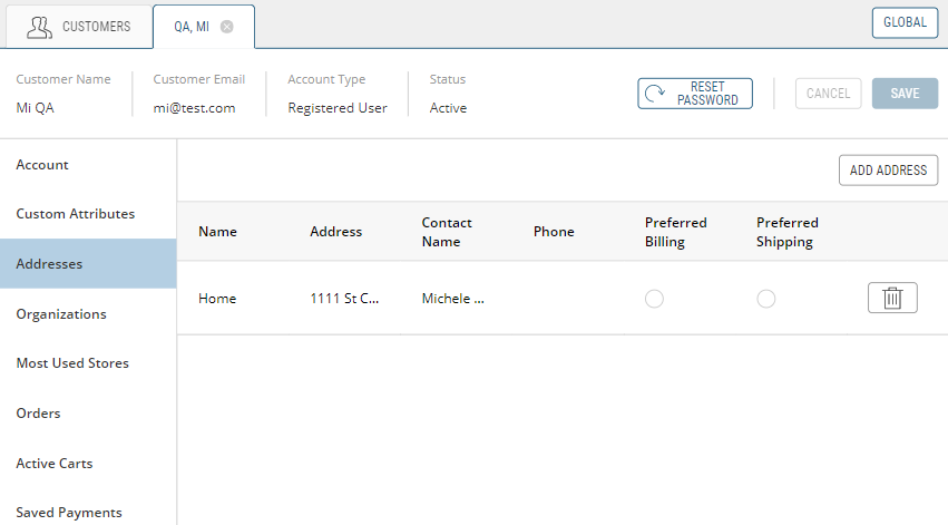 The Addresses tab is where a customer's address(es) is stored. You can have multiple addresses for a customer to match their living requirements. For example, if a customer has a chalet they spend summer weekends at, they can have orders fulfilled at their chalet address while receiving regular orders at their main residential address during weekdays.