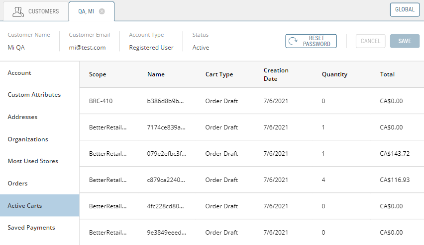 A customer's Active Carts tab shows the carts that they have put items in, but have not yet placed as an order. In these carts you can see the scope they exist under, the name generated for them, its type, creation date, quantity of items and total price.