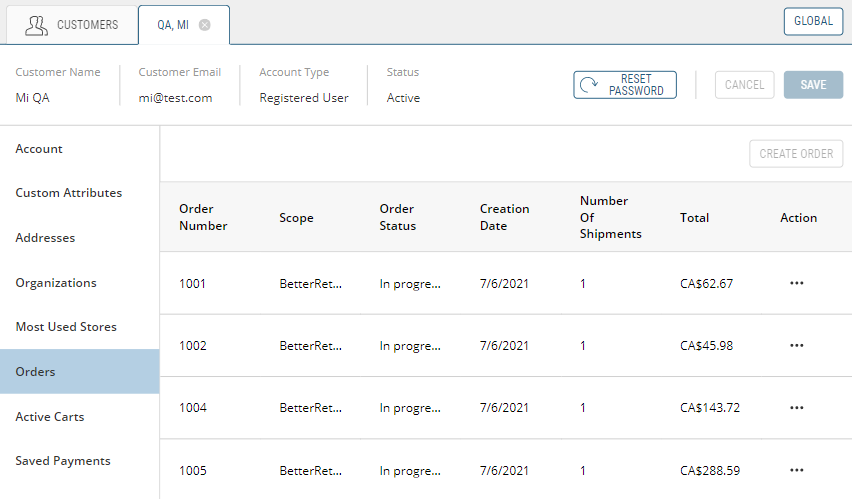 In Orders, you will see all of a customer's past, current and reoccurring orders along with details. For each order, you can see its order number, scope, status, creation date, number of shipments and total. Lastly, you can click the ellipses ... under the Action column to go to the View in Orders Module.