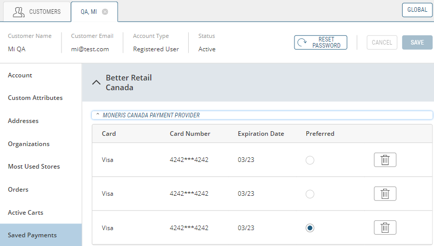 This tab shows the saved payment methods the customer has on record with the organization and that can be used again for future purchases.