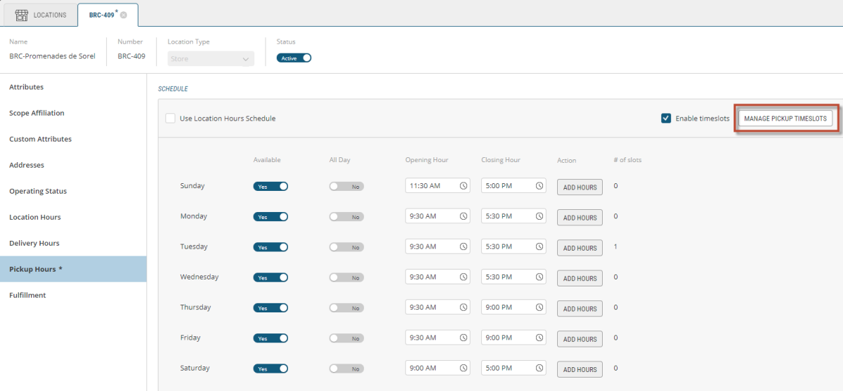 2. | In the Pickup Hours or Delivery Hours tab, click Manage Pickup Timeslots or Manage Delivery Timeslots. |