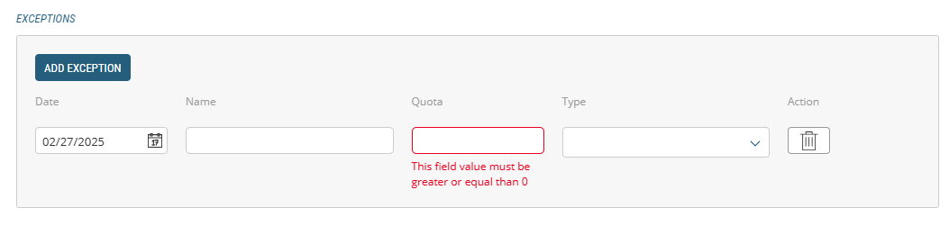 There are occasions when an established timeslot quota needs to be altered to match the realities of staffing fluctuations throughout the year. You can manage timeslots and quotas for each store. This feature is useful to ensure that you have sufficient staff scheduled to fulfill, manage pickups or deliver orders to your customers. Using this feature, you can define quota exceptions in the future.