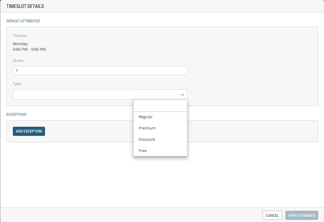 Fulfillment timeslot exceptions now let you assign both a type and a price override for specific dates, complementing existing timeslot quota functionality. This feature makes it possible for you to switch a timeslot from, for example, Regular to Premium on certain holidays or other special occasions. For instance, you might usually mark Tuesday afternoon timeslots as Regular, but if New Year’s Eve falls on a Tuesday, you could temporarily elevate that timeslot to Premium pricing.