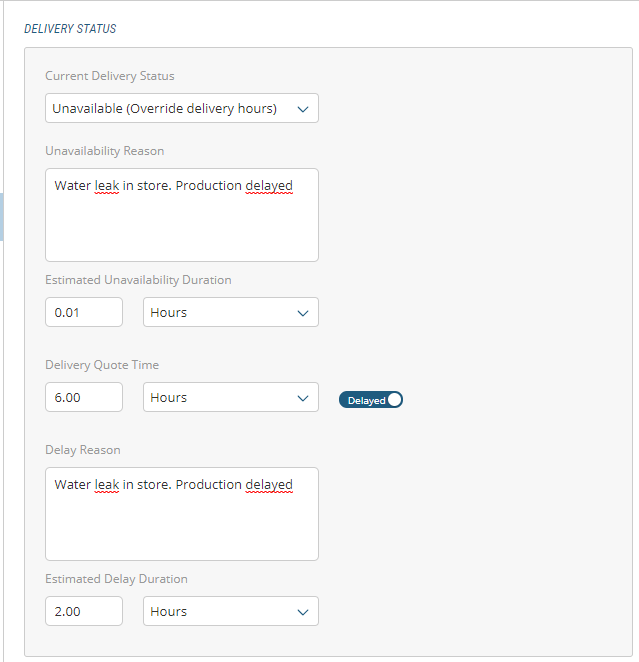 Use the Current Delivery drop-down menu to select Available (Based on delivery hours) or, |