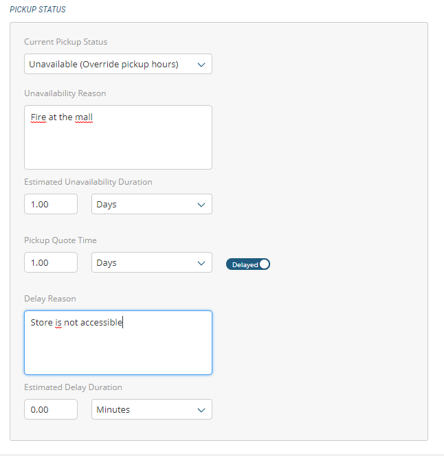 Use the Pickup Status drop-down menu to select Available (Based on delivery hours) or, |