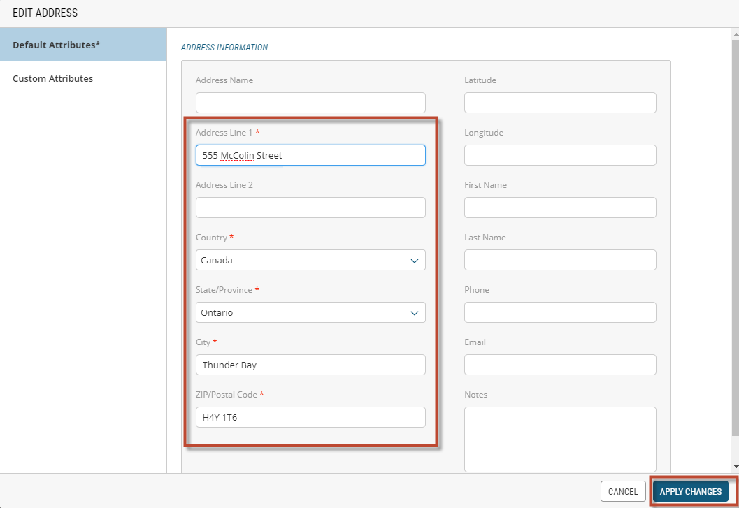 The Edit Address window contains five mandatory fields (identified with red asterisks).