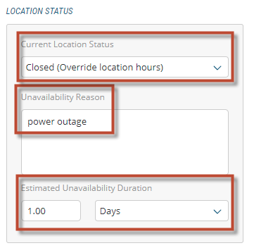 This tab allows you to override Delivery and Pickup status and set the location's current availability status.