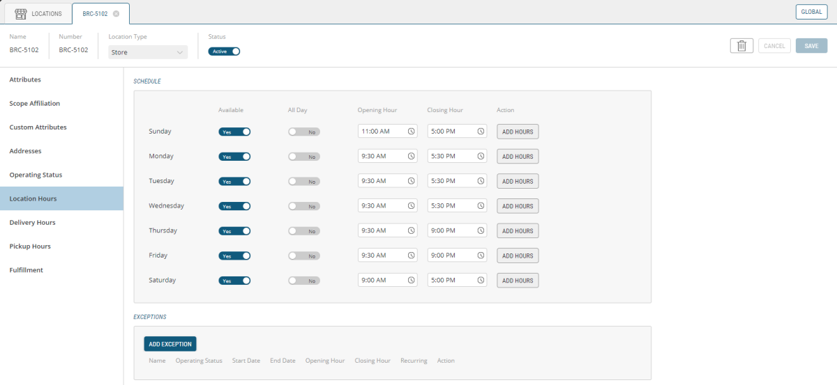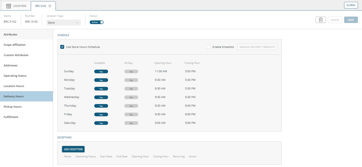 Locations each have their own account and attribute-specific parameters, which may require occasional modifying. Use the following steps to modify a location's address, scope affiliation, custom attributes, operating status, locations hours, delivery / pickup schedules and timeslot and fulfillment options.