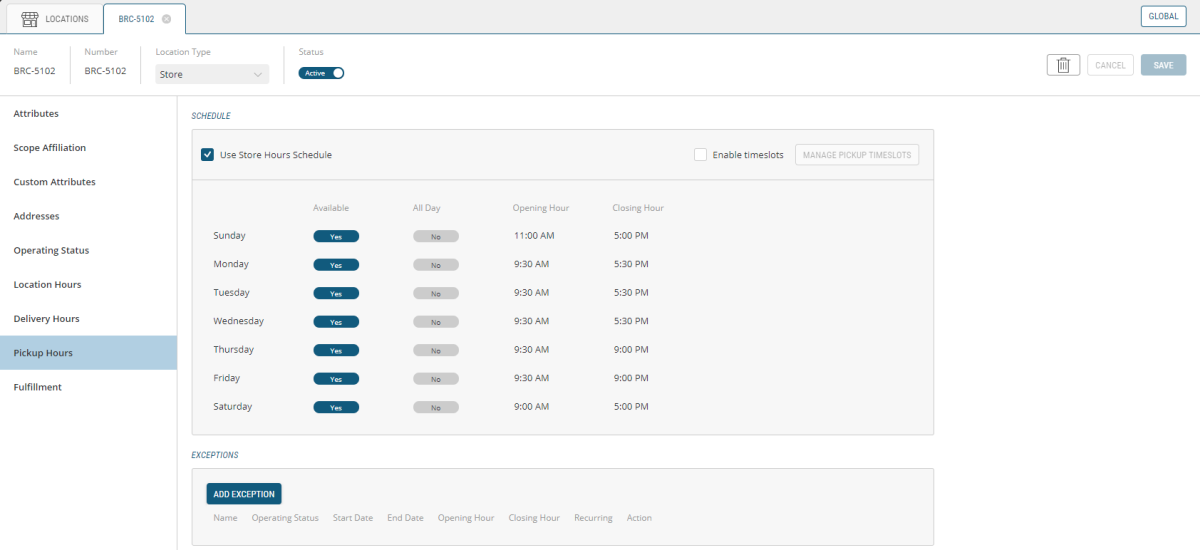 If the store is virtual, the following steps do not apply as the Pickup Hours tab is inactive and cannot be modified.