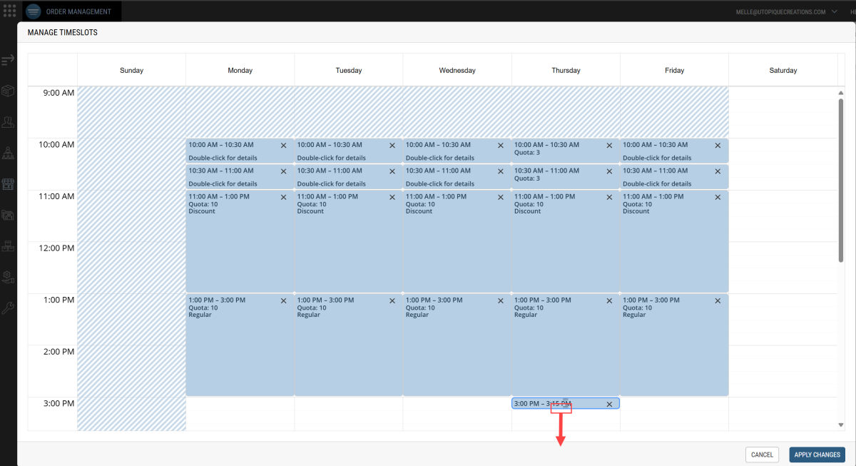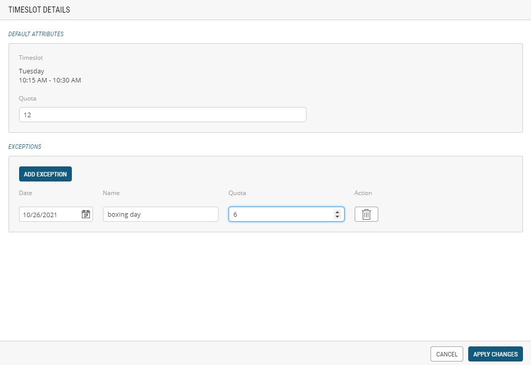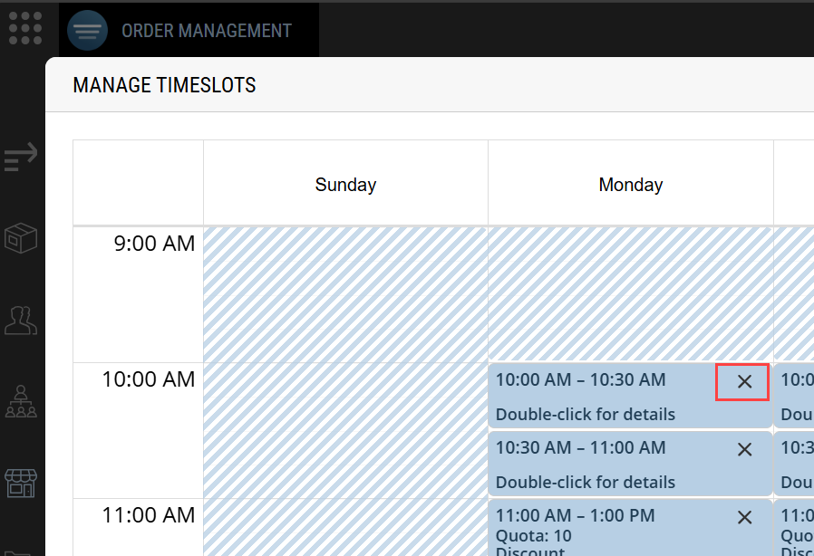 There are occasions when an established timeslot quota needs to be altered to match the realities of staffing fluctuations throughout the year. You can manage timeslots and quotas for each store. This feature is useful to ensure that you have sufficient staff scheduled to fulfill, manage pickups or deliver orders to your customers. Using this feature, you can define quota exceptions in the future.