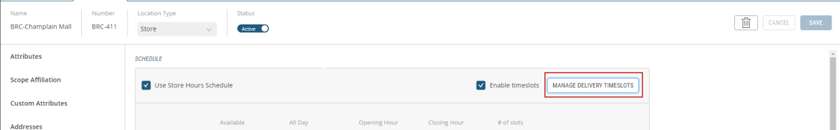 In the Pickup Hours or Delivery Hours tab, click Manage Pickup Timeslots or Manage Delivery Timeslots. |