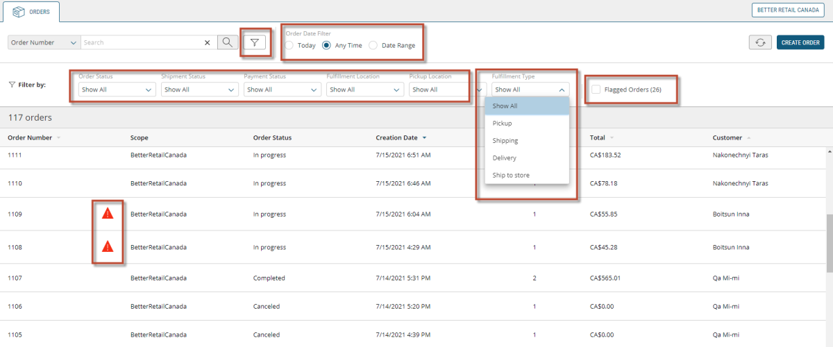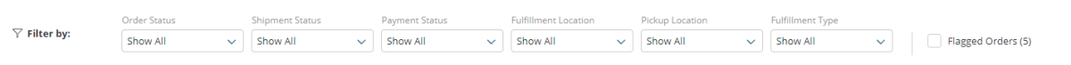 You can narrow down an orders list to pinpoint a particular order by applying one or more filters to the list of orders. You can use one or a combination of filters that include order date, fulfillment location, pickup location, fulfillment type, fulfillment date, order status, shipment status and payment status.