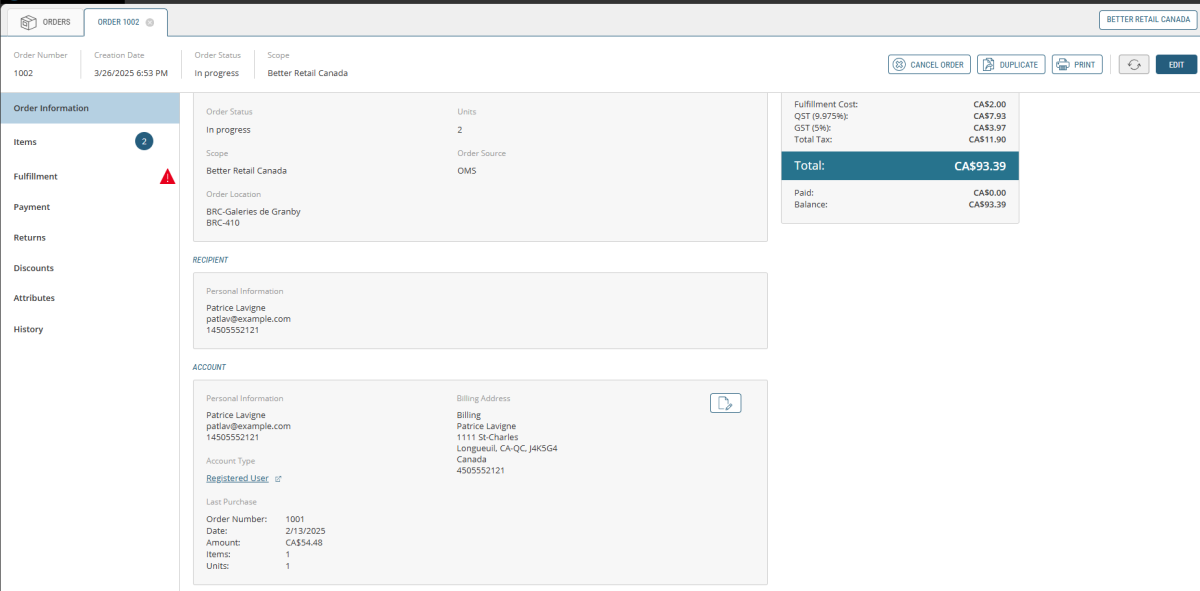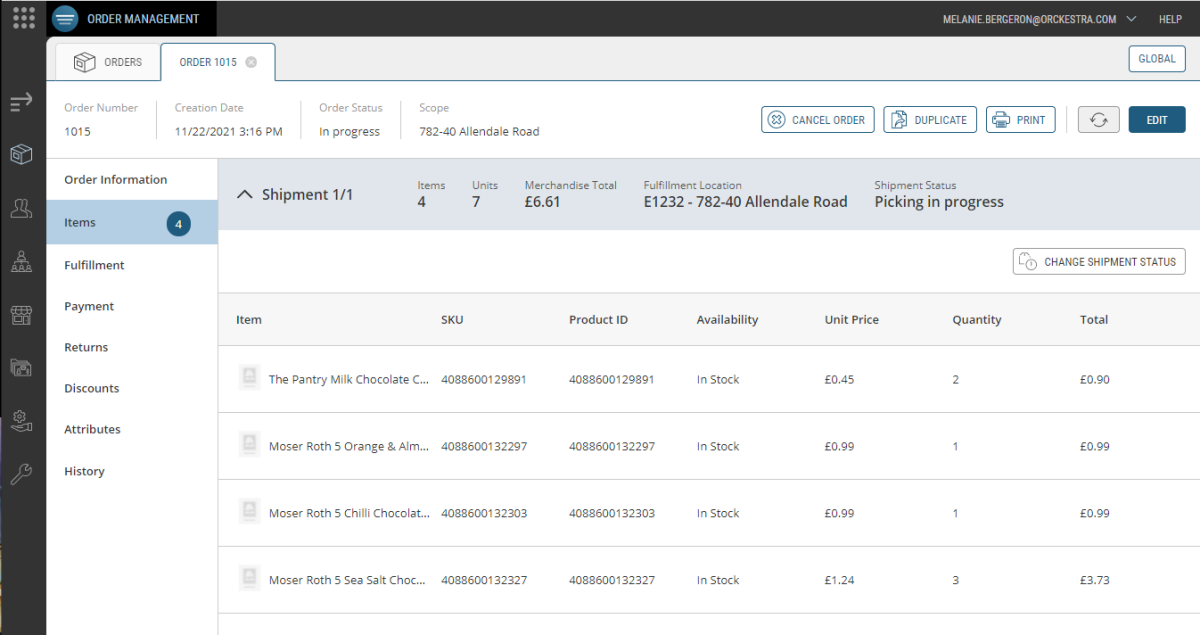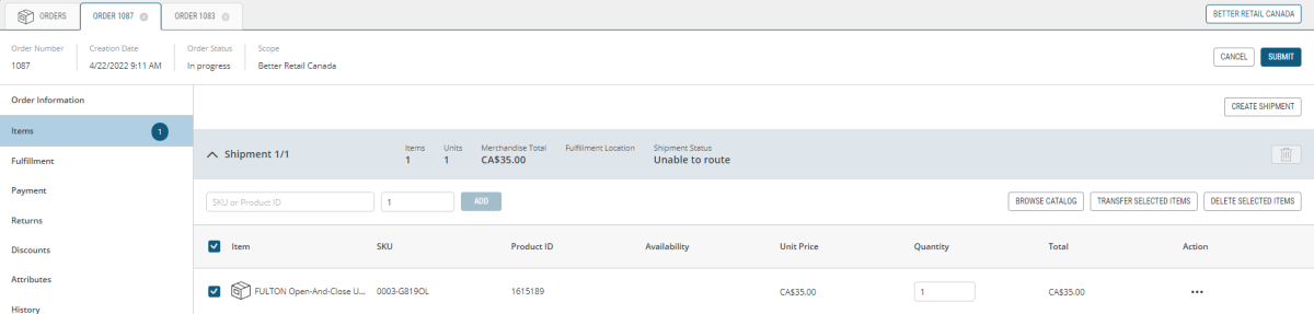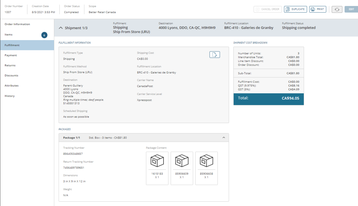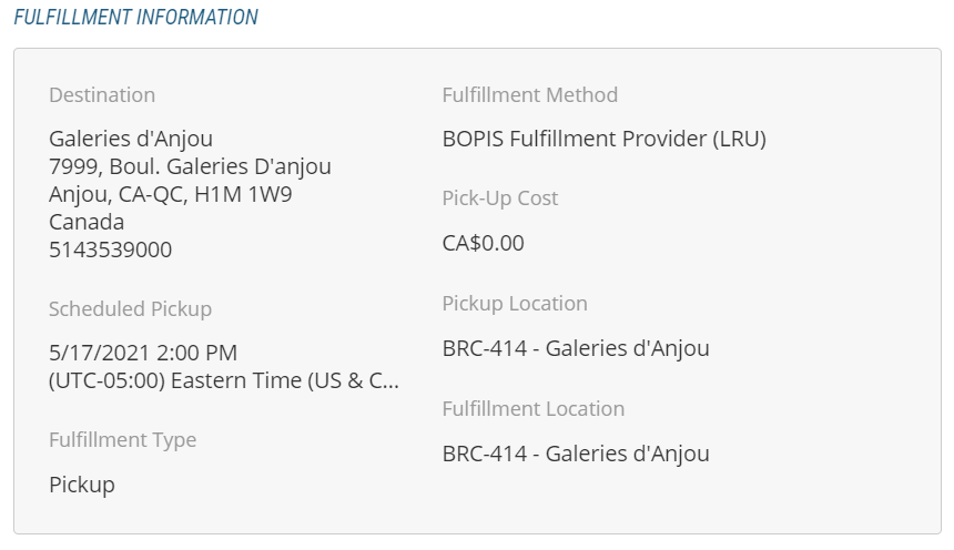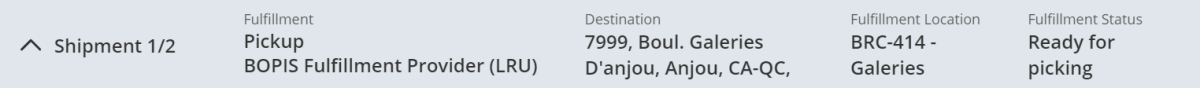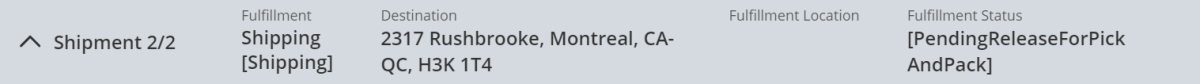 Clicking the Fulfillment tab reveals the fulfillment details pertaining to the order. Since an order can be divided into multiple shipments to speed up its fulfillment, one or several shipments may appear.