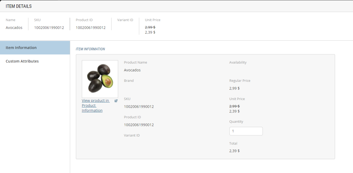 You now have the ability to get details for items (line items) in an order. As a CSR agent, you can view Item custom attributes associated with any order item so that you can respond to customer's inquiries or requests.
