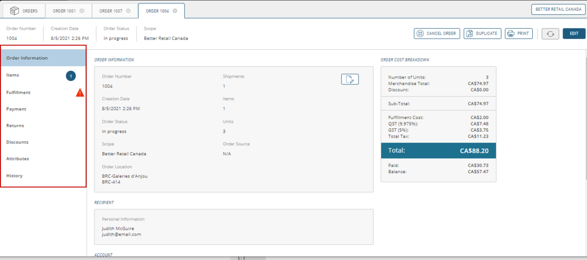 Clicking an order opens the order's details. An order is composed of eight sections that include pertinent information about an order. See image below: