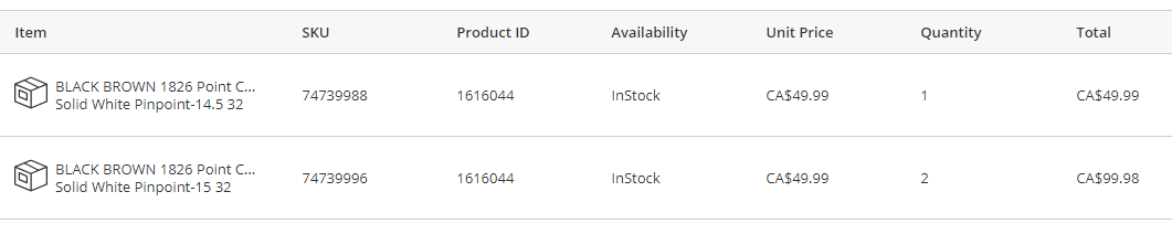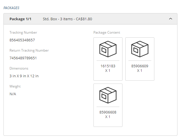 • | Under Package Content, you will find the list of items with their ID/SKU and quantity for each item |