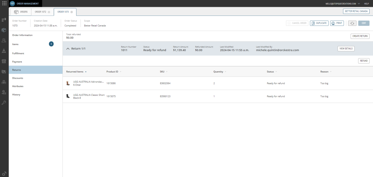 The Returns tab allow you to manage returns and issue refunds when items are returned. In this tab, you can view the following information.