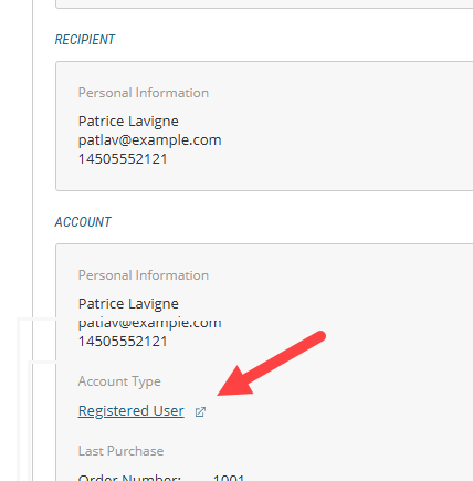 When a customer is registered in Orckestra Commerce Cloud, a link appears under the Account Type. Clicking the link opens the customer record in another tab of your browser.