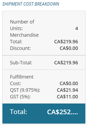• | Merchandise costs, fulfillment costs, discounts and applicable taxes are automatically calculated, resulting in the Total (at the base of Shipment Cost Breakdown box) |