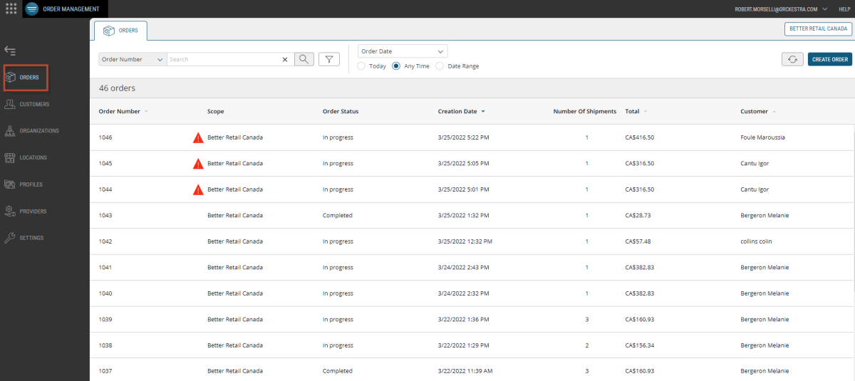 Viewing orders allows you to view, verify and revise information that was previously recorded about the orders. When you open the Order Management application, the Orders tab is opened by default and the list of orders is displayed .