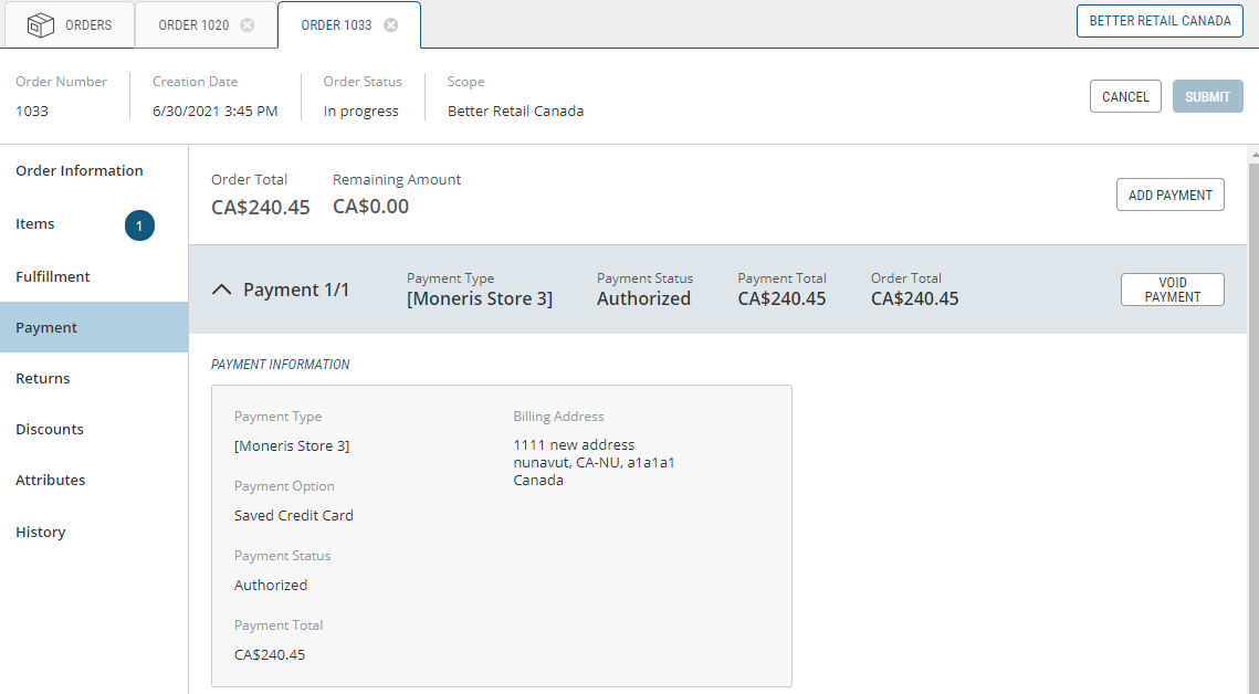 A payment can only be voided if the payment status is new, otherwise, the Void Payment button is disabled. When you void a payment, the entire payment is removed from the user interface and the remaining amount in the payment tab header is updated. When you remove the only payment in an order, the payment is replaced by a blank payment amount which is the order total.