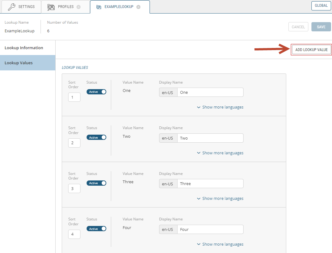 This opens a New Profile Lookup tab where you will enter the Lookup Name and can add a Description and Display Name(s). You can then add as many Lookup Values as you need by clicking ADD LOOKUP VALUE, then fill them out with their Value Name. Additionally, you can add a Sort Order and Display Name(s) as well as set an Activity Status. Once you're done, remember to Save.