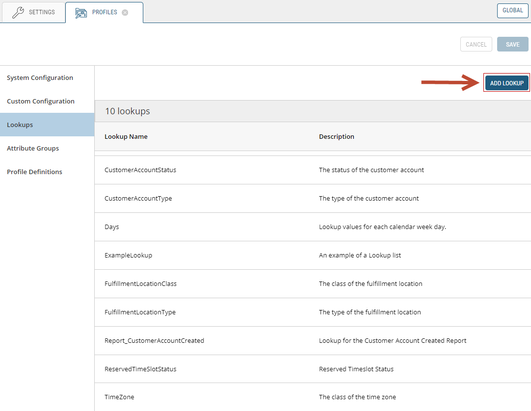 To understand if you need to create a Lookup, first check the About Lookups topic to learn more. Navigate to the Settings module of the Order Management application and select the Lookups option in the Profiles section of the Settings module. In the Lookups tab, click Add Lookup.