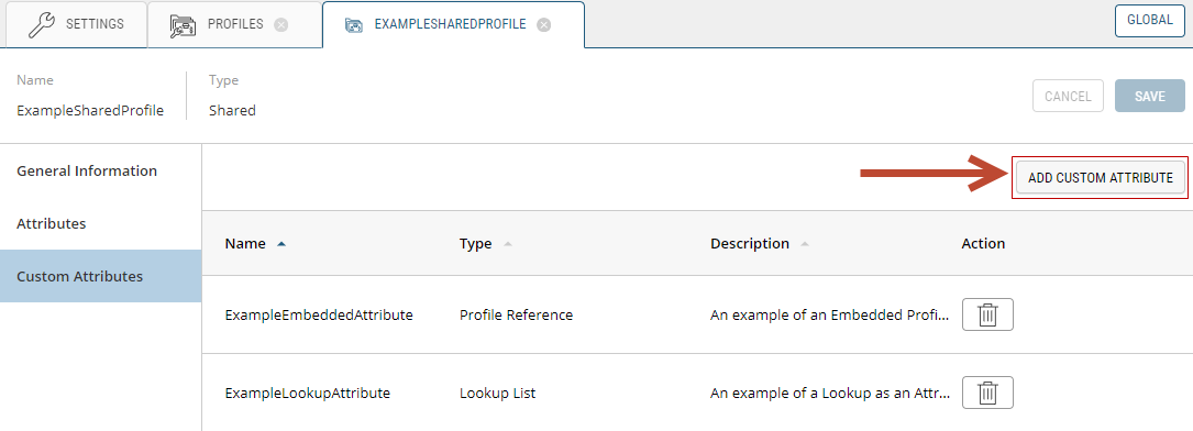 When creating a Custom Profile, you may want to link an existing Profile to it. To do this, go to the Settingsmodule of the Order Management application and open the Profile Definitions section. Select the Profile you want to link, then select the Custom Attributes section.