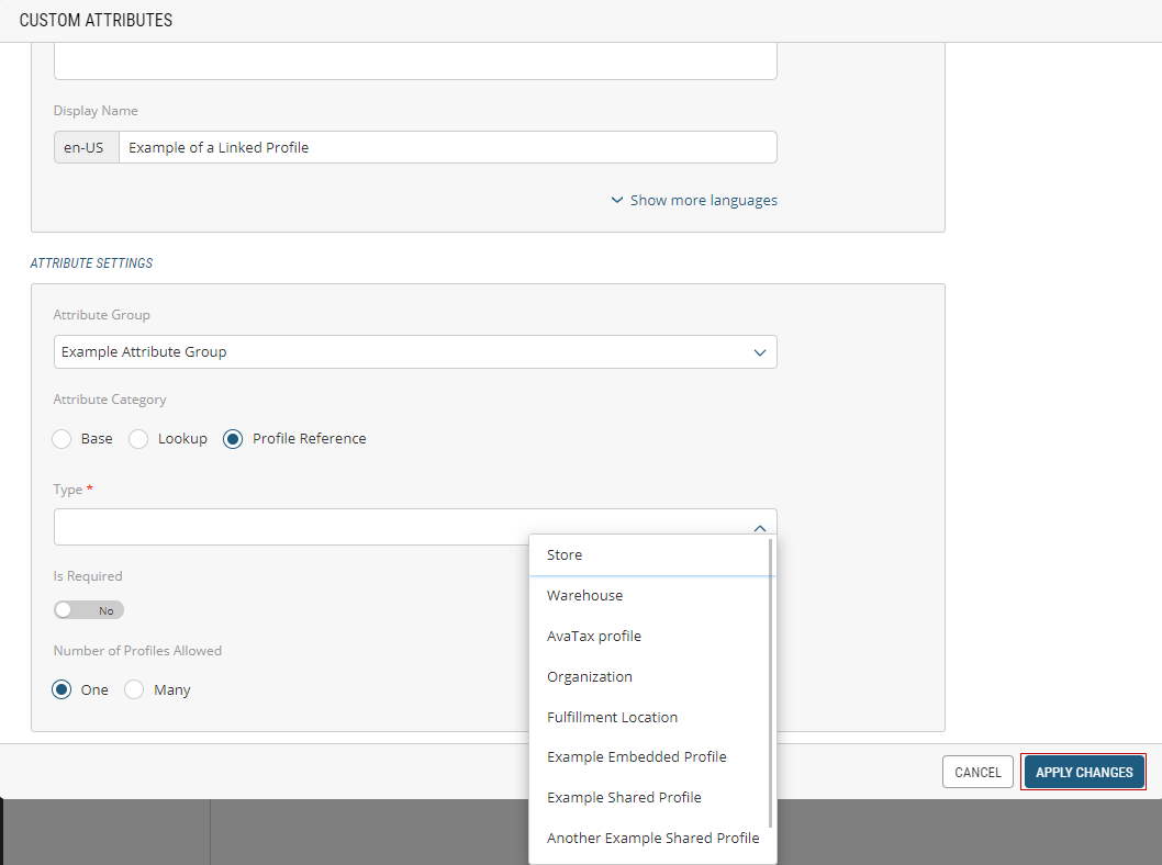 This will open up a new window where you can create the new Custom Attribute. To link a Profile to your desired parent, select the Profile Reference or Lookup option and then select the linked Profile from the drop-down menu. Click Apply Changes at the bottom-right of the window, then Save.