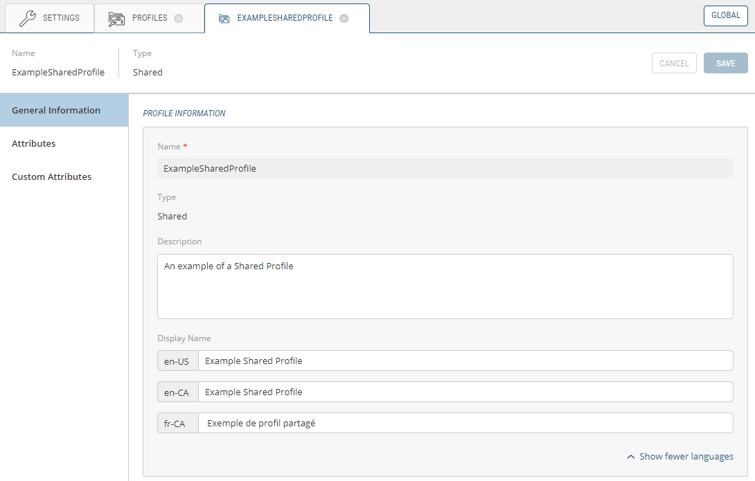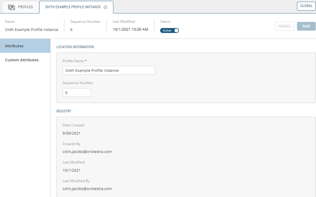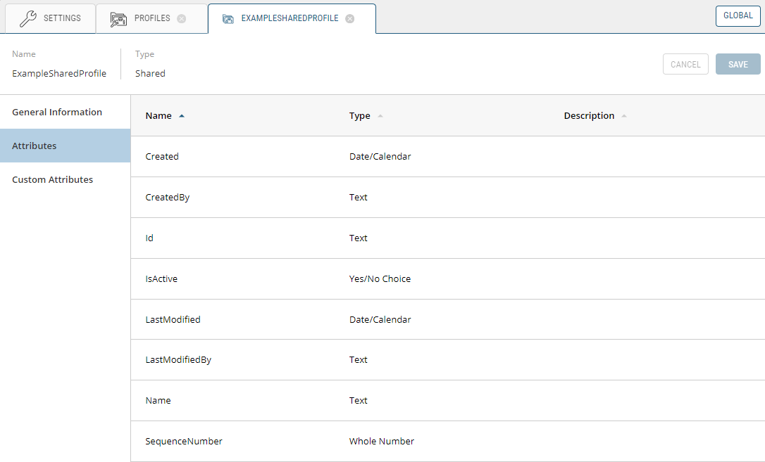 There are further customization options for all types of Profiles in the Settings module of the Order Management application. In here, you can select the Profile you wish to modify by following the instructions in Viewing Profiles From Profile Definitions, you will select the Base or Custom Profile you want to modify and it'll open in a new tab. In this expanded view, you have the ability to alter the General Information, Attributes and Custom Attributes of the Profile.