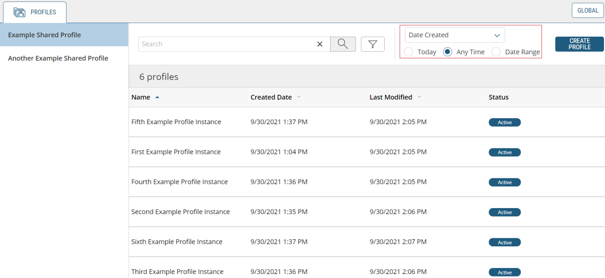 Within each Profile are its instances. You can sort these instances by their name, creation date or when they were last modified and filter the last two parameters by the current day, a date range, or any time. To further view a specific instance, click on it and its details tab will open.