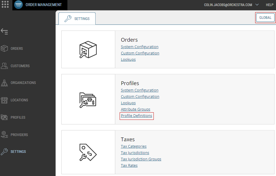 To find a Profile within the Settings module, first select the appropriate Scope at the top-right of the page before clicking the Profile Definitions section shown below: