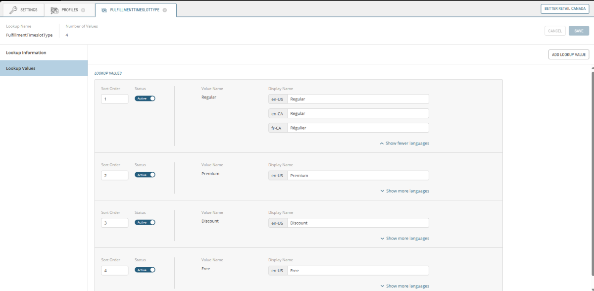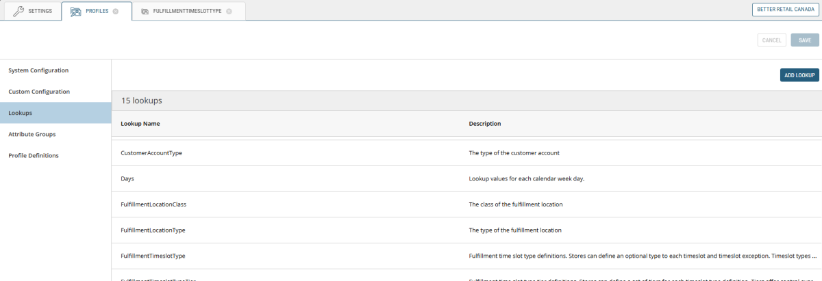 This lookup defines labels for timeslot categories used in the Order Management application. Stores and fulfillment locations can associate an optional type to each timeslot or timeslot exception, enabling more granular control over fulfillment pricing and scheduling.