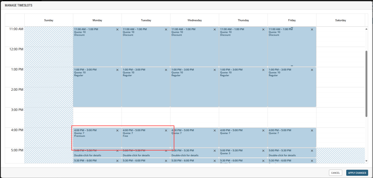 These values will appear in a store or warehouse configured timeslots. In the example below, timeslots have been configured with different service level and pricing. The timeslot for Monday 4PM has been set to premium whereas the same timeslot on Tuesday has been defined as Free.