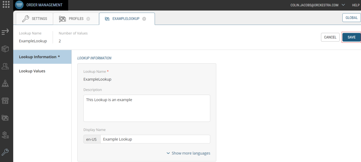 Once a Lookup has been created, you can modify it's Description, Display Name and Values. Click Save after any revisions. |