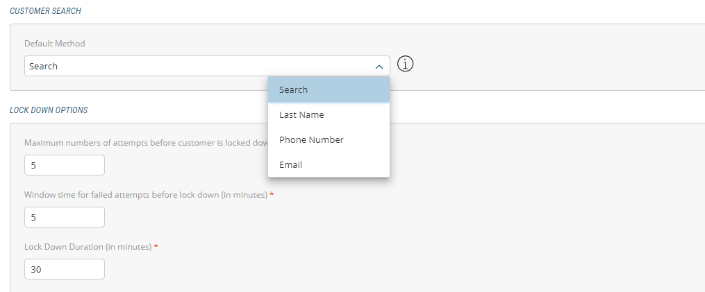 | 1. | In the Customer Search dialog box, select the Default Method from the drop-down menu (Last Name, Phone Number or Email). |