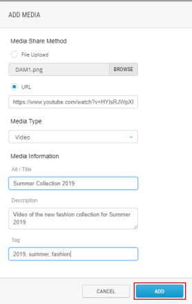 Important: when using the URL option, ensure your image file name follows the naming convention configured in Media Configuration.For more information, see Managing Media Configuration. When using the File Upload option, your file name is converted automatically.