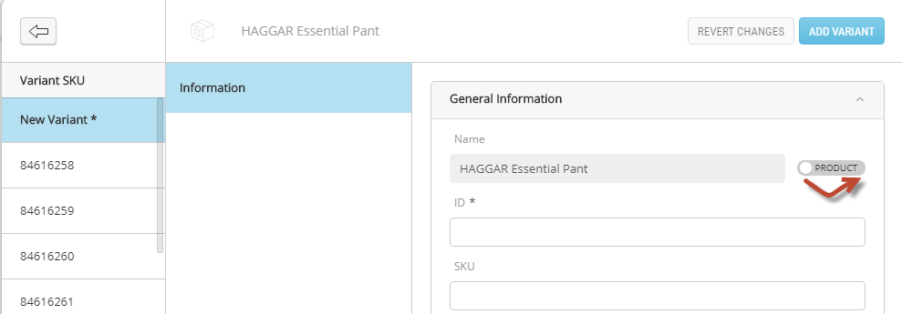 If the variant requires a different name than the base product, slide the toggle to switch between the Variant or Product attribute value. |