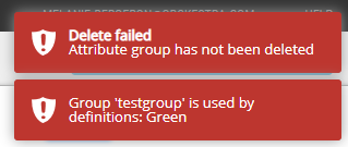 When deleting a group with attributes already in use, an error message appears at the top corner of the screen: