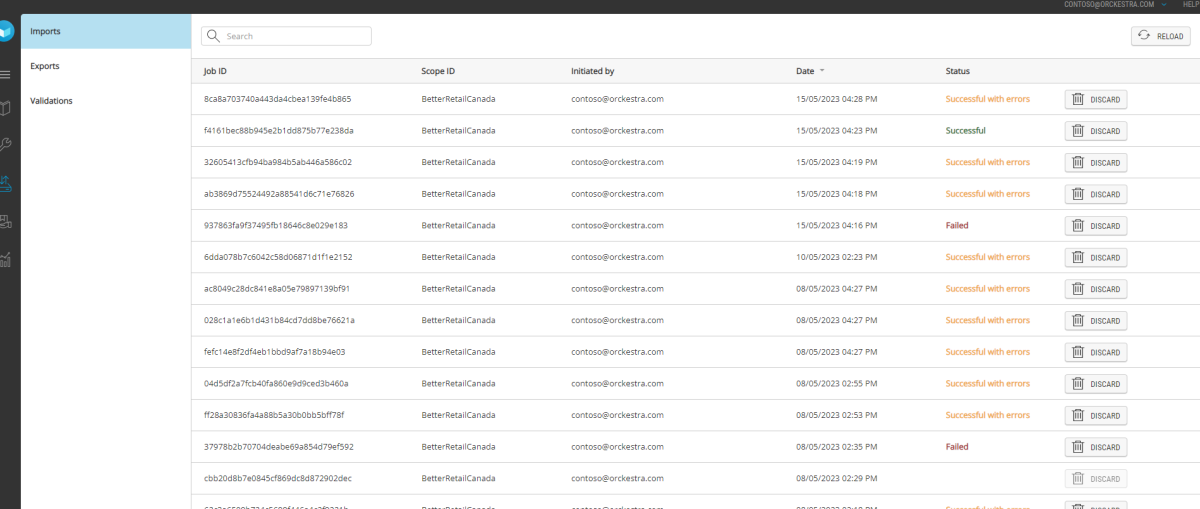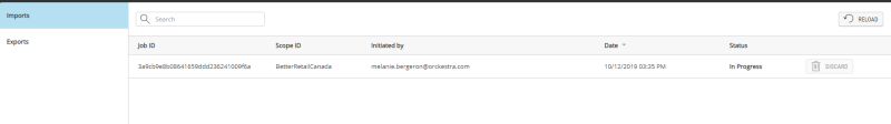 8. | The Imports page opens. The activity log of all import tasks initiated by other Orckestra Commerce Cloud users are also listed, if not, they are discarded. |
