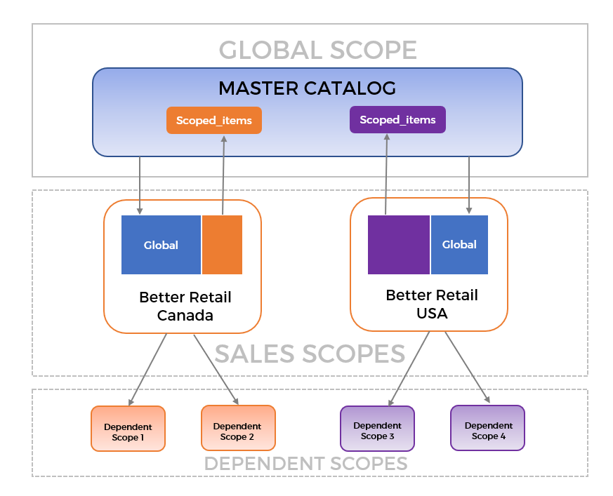 For example: A dependent scope gets the same product information, taxonomy and structure as the catalog of its parent sales scope.