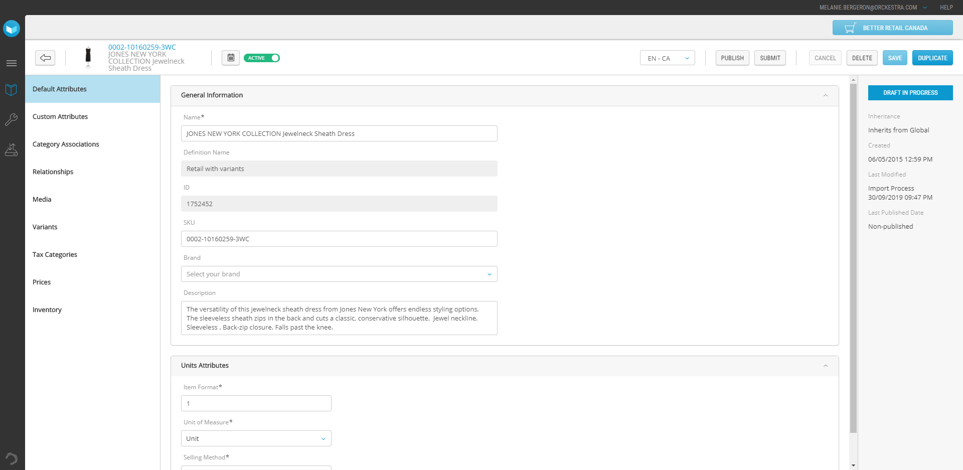 Note: When editing a product, the changes you make must go through a the publication workflow. Saved modifications are not applied live to your website unless they are published.