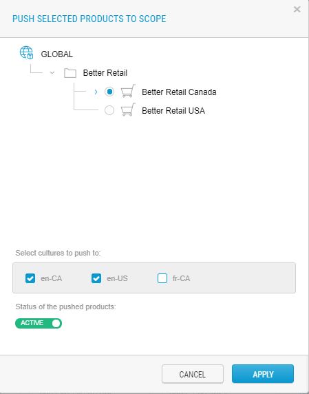 Instead of importing products from the Global scope, the entire Global scope catalog or a partial set of products can be pushed to a sales scope. The products pushed to sales scope automatically inherit from the global scope unless the inheritance is broken.