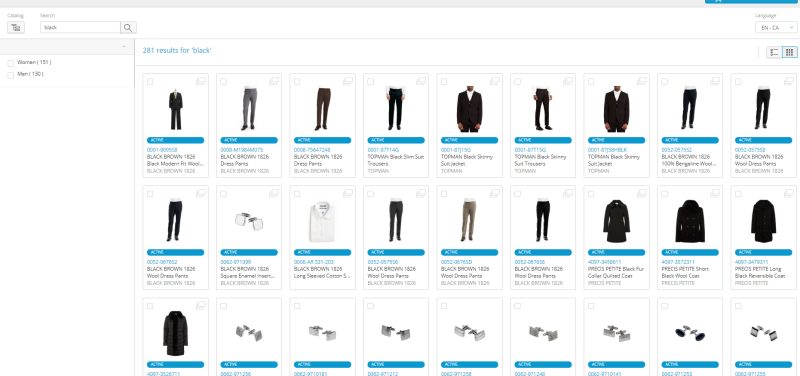 For example, if you perform a search using the keyword "black", all the products that contain "black" in the description, attributes and lookups will return in the search. You can then further refine the results using the facets. In this example, only two facets return: Women and Men.