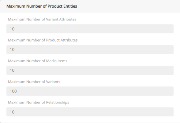In order to manage the size and complexity of your catalog, it is possible to set maximums for the various entities that make up your products: