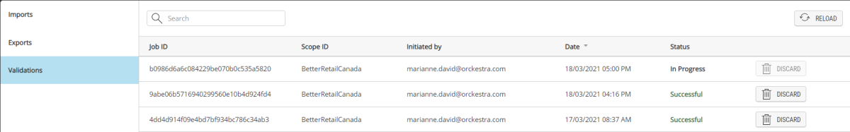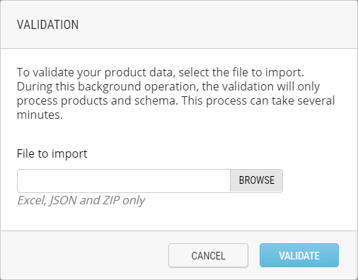 It is possible to use the Product Management application to validate import data in .xls, .json or .zip files prior to importing them into the system. This limits potential errors and simplifies the import process.