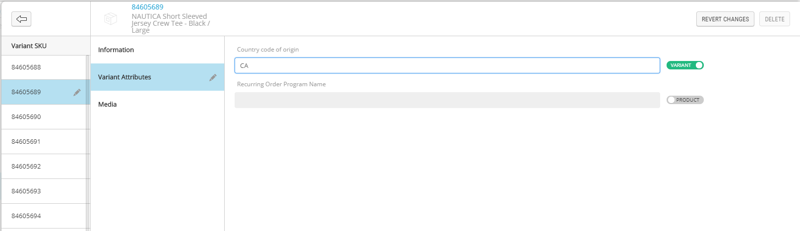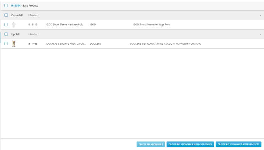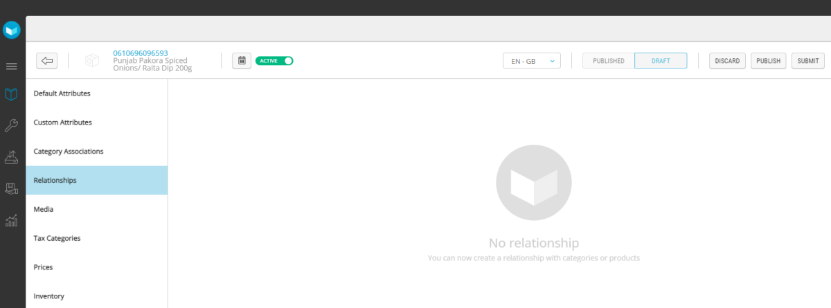 Click a product tile or a product in the list to display the product details panel. The product details panel includes Default Attributes, Custom Attributes, Category Associations, Relationships, Media,